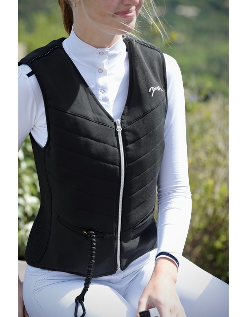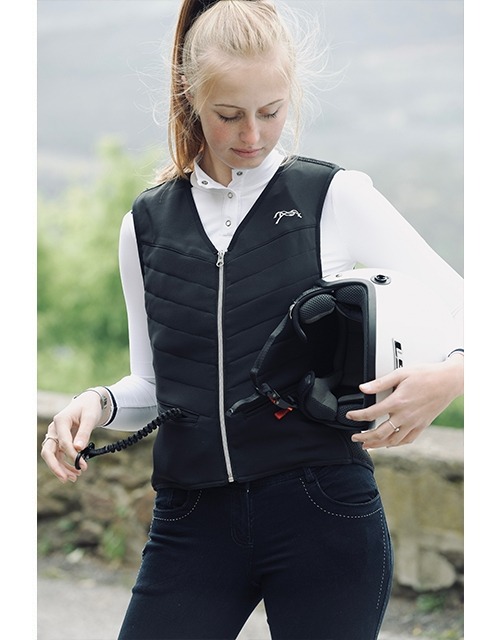 Ce dernier est conçu pour allier sécurité et esthétisme en répondant à toutes les attentes des cavalières qui souhaitent monter à cheval en toute sécurité, tout en gardant élégance et chic ;). Il peut être aussi bien utilisé à l’entraînement qu’en concours hippiques. Le gilet se ferme par une fermeture éclair sur le devant, il est doté de deux bandes stretch de chaque côté pour assurer le plus grand des confort. La recharge est cachée dans une fausse poche sur le devant et le logo Pénélope est brodé en argenté sur le cœur. Léger, 1.3 kg seulement, il se fond parfaitement dans le look de toutes les cavalières… Le gilet Airswift est doté du C-protect Air – Airbag system et réagit en moins de 0.1 seconde. Il assure une protection supplémentaire au niveau des cervicales avec un rajout de 2 cm au moment du gonflage au niveau de la nuque. Il est fabriqué en France. Il libère une pression de 250 mbar sur l’ensemble du buste, et protège le thorax, l’abdomen et le dos (des cervicales au coccyx)